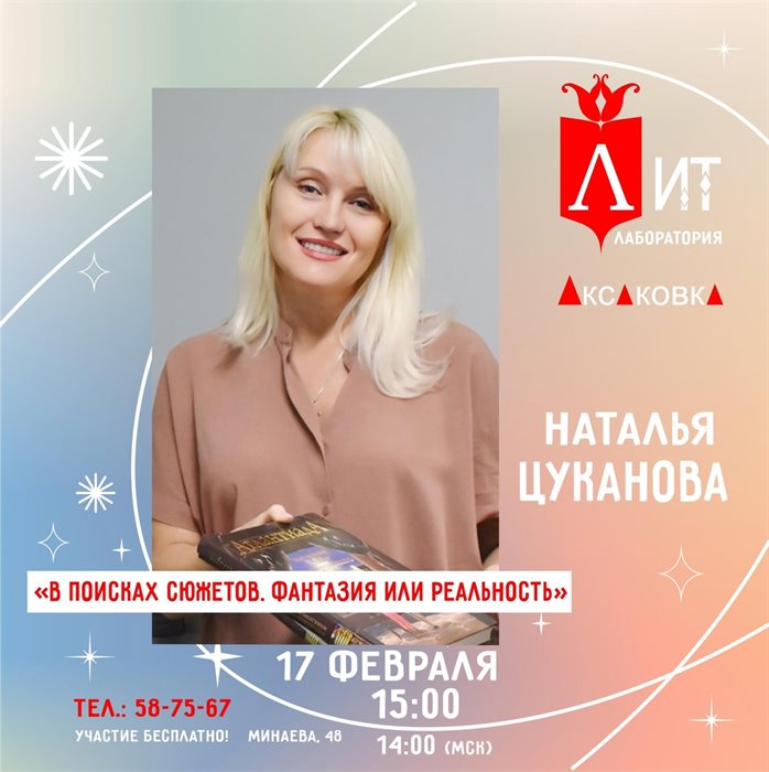17 февраля в Аксаковке состоится занятие, которое проведёт тележурналист, писатель, генеральный директор издательского дома «Алдоор», лауреат премии имени Александра Невского Наталья Цуканова. Она раскроет литературные секреты о том, как соединить в сюжете произведения художественный вымысел и исторические факты в увлекательной форме, расскажет, как составить приключенческий авантюрный сюжет и насытить его обширными и достоверными историческими материалами. Занятие пройдет в рамках Лаборатории детского чтения и литературного творчества. 12+.