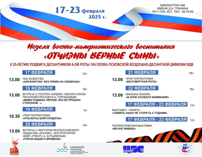 С 17 по 23 февраля в Ульяновске пройдет неделя военно-патриотического воспитания «Отчизны верные сыны». Мероприятия – в афише.