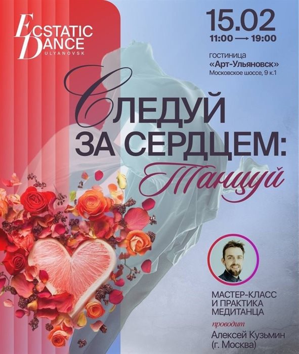 15 февраля состоится волшебное путешествие в мир танца и самовыражения, где каждое движение обретает смысл и глубину, - вечеринка Ecstatic Dance + Heart in Motion***. Две удивительные практики помогут наладить контакт с телом, чувствами и внутренней энергией, открывая путь к гармонии и свободе. Ведущий: Алексей Кузьмин (Москва) — талантливый DJ Ecstatic Dance*** и преподаватель осознанного движения. 18+.