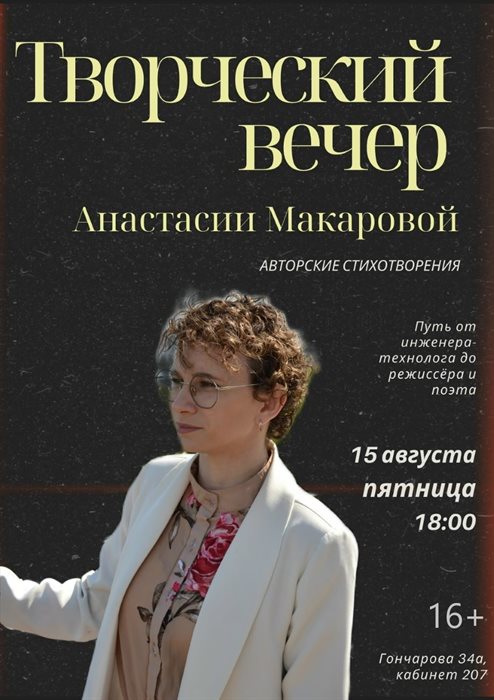 Любителей театра сегодня ждут на творческом вечере Анастасии Макаровой – руководителя театральной мастерской «ЗазеркальЦы». Это история о том, как родилась мастерская, как инженер стала режиссером, история о любви к театру. Героиня вечера прочтет свои стихи и любимые произведения других авторов (16+).