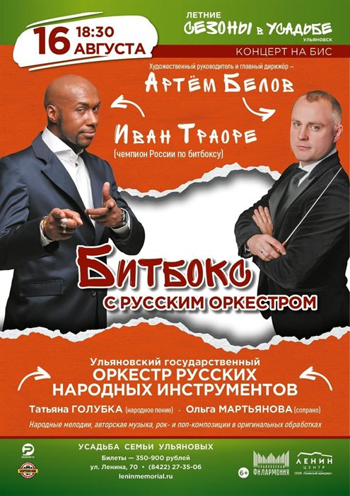 В субботу меломанов ждет очень необычная программа - «Битбокс с Русским оркестром». На концерте прозвучит битбокс и... музыка Антонио Вивальди, битбокс и... опусы Александра Бородина, Эдварда Грига, битбокс и... русские народные песни, битбокс и... ну наконец-то! - композиции рок-групп. А ещё в программе уже полюбившиеся ульяновской публике сочинения Артёма Белова, саундтрек из компьютерной игры Genshin Impact* и многое другое. Солисты программы - чемпион России по битбоксу Иван Траоре, Ольга Мартьянова (сопрано), Татьяна Голубка (народное пение), Глеб Авдеев (балалайка), Сергей Павлов (ударные), Виктор Липилин (баян). За дирижёрским пультом - художественный руководитель и главный дирижёр оркестра Артём Белов (6+).