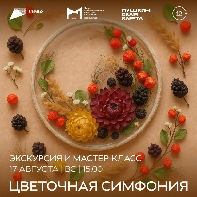 В Музее изобразительного искусства XX-XXI вв. на воскресенье запланированы экскурсия и мастер-класс по изготовлению декоративного панно из сухоцветов «Цветочная симфония». Посетители узнают об истории икебаны, её стилях, секретах сбора и сушки природных материалов. Участники научатся создавать объемные флористические композиции из засушенных цветов и растений, помещенные в прозрачный футляр. (12+).