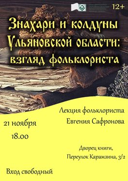 Как происходит процесс становления знахаря? Как обучаются колдовству? Как лечат целители и в кого могут превращаться колдуны? Где находятся самые «колдовские» села Ульяновской области? На эти и другие вопросы ответит кандидат филологических наук, фольклорист и писатель Евгений Сафронов – во время своей лекции на «Научной пятнице», которая состоится 21 ноября во Дворце книги.
