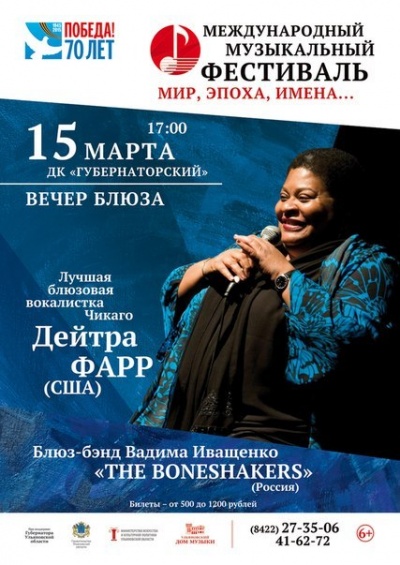 Свадебным подарком для молодых от ЗАГСа и филармонии станет выступление джазовой вокалистки из США, лидирующего женского голоса чикагского блюза Дейтры Фарр и популярного московского блюз-бэнда талантливого гитариста и шоумена Вадима Иващенко «TheBoneshakers». Концерт состоится в ДК «Губернаторский» 15 марта в 17 часов.