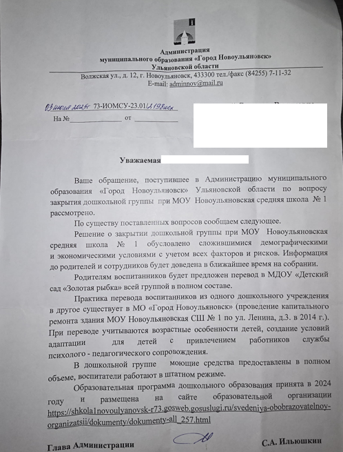«Но решение о закрытии дошкольной группы принималось не мной, - уточнила ulpravda.ru исполняющая обязанности директора новоульяновской школы № 1 Екатерина Веретенникова. – Поэтому не вижу оснований давать официальный комментарий по сложившейся ситуации».