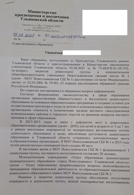 Так, в министерстве просвещения и воспитания Ульяновской области, в которое обратились родители, подтвердили их право на выбор детского садика.