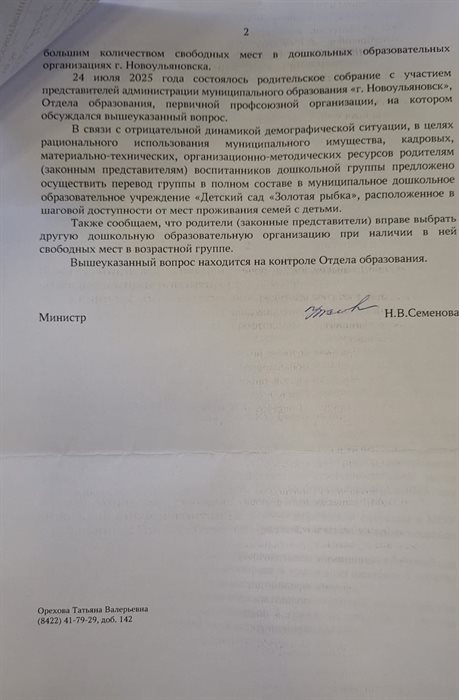 «В связи с отрицательной динамикой демографической ситуации, в целях рационального использования муниципального имущества, кадровых материально-технических и организационно-методических ресурсов родителям воспитанников предложен перевод группы в полном составе в «Золотую рыбку» - детский сад, расположенный в шаговой доступности. Также сообщаем, что родители вправе выбрать другую образовательную организацию при условии наличия в ней свободных мест».