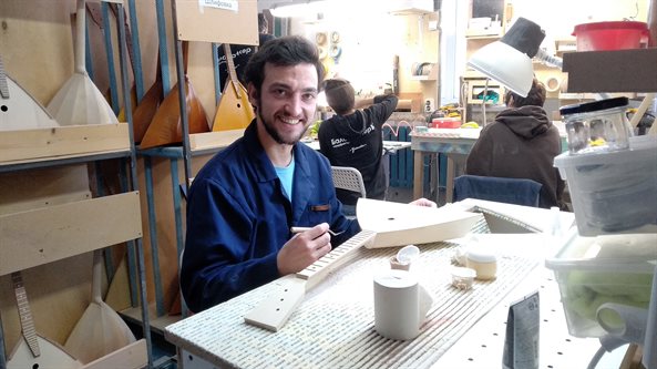 Нила на производстве ни в коем случае не жалели - показать решили сразу как можно больше из процесса изготовления инструмента. Причина проста - у французского стажера заканчивалась виза. Он шпаклевал инструменты, циклевал их, то есть проводил чистовую финальную обработку. А еще он промасливал кобылки - это деталь балалайки, которую многие из нас знают как порожек.