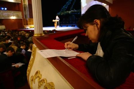А вот результаты регионального диктанта, который 12 апреля писали в зале драматического театра, будут известны только после 20 апреля. Участники ульяновской областной акции за сохранение и продвижение русского языка написали текст русского писателя и общественного деятеля Михаила Лобанова о творчестве Александра Островского. Его продиктовала министр образования и науки Ульяновского региона Екатерина Уба, а в числе пишущих оказались глава региона Сергей Морозов, замгубернатора Михаил Сычев, представители власти и бизнеса, преподаватели, студенты - всего порядка 600 человек.
