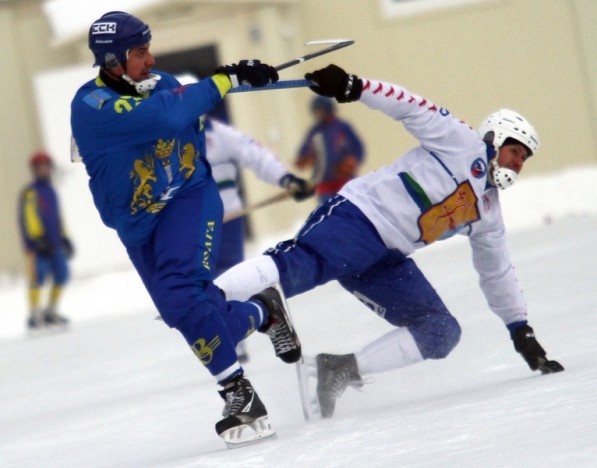 Думается, увиденное порадовало ульяновских болельщиков. Во всяком случае, лед наша команда покидала под аплодисменты. Практически на протяжении всей игры «Волга» доминировала на поле и еще в первом тайме дважды огорчила гостей. На 31-й минуте после розыгрыша углового отличился капитан ульяновской команды Игорь Ларионов, а пять минут спустя он же заработал пенальти. К «точке» подошел новичок «Волги» Петр Захаров (на фото – в синей форме) и неотразимо пробил в верхний угол ворот Михаила Шиляева – 2:0.