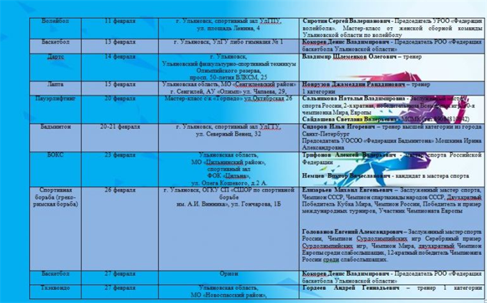 В феврале ульяновцы смогут посетить 20 спортивных мастер-классов