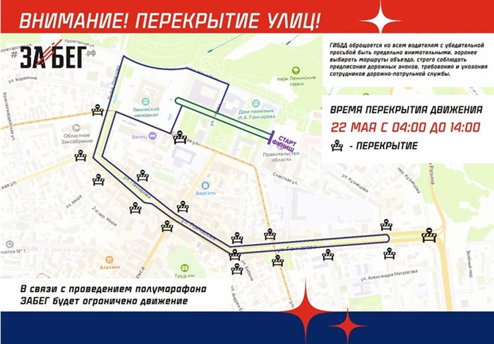 «Остановка транспортных средств на улицах, включенных в маршрут забега, будет запрещена с 20:00 21 мая до 14:00 22 мая», - дополняют в пресс-службе администрации Ульяновска.