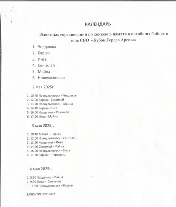 В областных соревнованиях по хоккею с шайбой «Кубок Героев Арены», посвященных памяти ульяновских бойцов, погибших в зоне СВО, примут участие шесть команд муниципальных образований Ульяновской области – Чердаклы, Барыш, Инза, Сенгилей, майна, Новоульяновск. Турнир пройдет по круговой системе со 2 по 4 мая. Откроется соревнование матчем Новоульяновск – Чердаклы, который начнется 2 мая в 10 часов 40 минут.