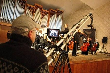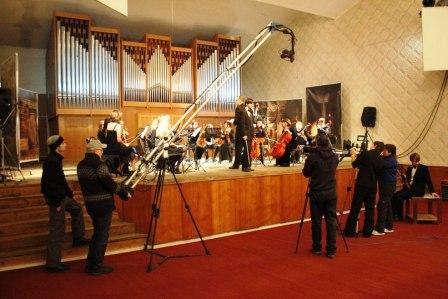 Как рассказали в пресс-службе филармонии, в съемках участвовал один из главных героев, московский актер, исполняющий роль юного скрипача. Кроме того, заранее было анонсировано, что поучаствовать в создании фильма могут и ульяновцы, в итоге зрительный зал был заполнен актерами-добровольцами.