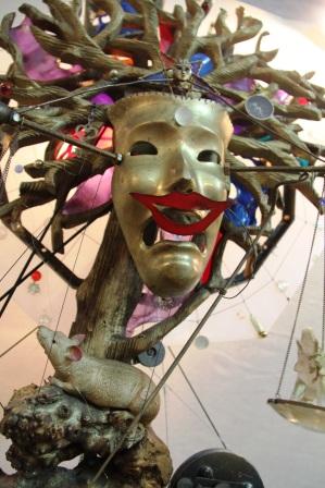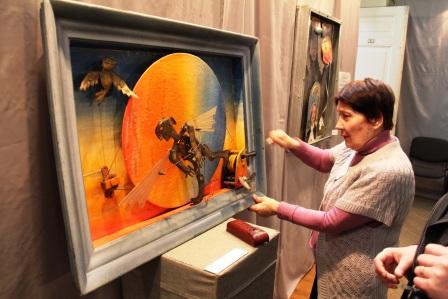 Ощущения от выставки Санкт-Петербургского театрального художника Виктора Григорьева передать словами очень сложно - это надо видеть. Более того, практически все его экспонаты надо не просто видеть, а наблюдать в движении, и в целом они создают какой-то свой волшебный мир, чем-то похожий на полотна Сальвадора Дали. В этом мире Пегас-единорог в беспрестанном круженье гонится за солнцем, Ихтиандр преследует золотую рыбку, а балерина из «Лебединого озера» вечно оживает в пируэтах. Можете ругать меня за дурной вкус, но Шагал, например, меня впечатлил гораздо меньше, хотя ассоциации и с этим художником данная выставка тоже навеяла. Всяческие колесики, тросики и прочие механизмы ничуть не мешают жизни персонажей автора. Как у Дины Рубиной в ее знаковом романе «Синдром Петрушки»: «Черт произносит: «Это называется - черта с два!» - и раздваивается на две одинаковых куклы» В картине, которая называется «Осколки», маска, послушная рычажку, медленно собирается в целое лицо. Апо периметру картины, оформленному старинными фотографиями, неспешно путешествует большая лупа, выхватывая лица людей, которых давно уже нет на этом свете, заставляя посетителей задумываться - что стало с этими людьми, какова их судьба? Вообще выставка Виктора Григорьева очень метафорична. И каждый его экспонат вызывает жгучее желание рассматривать каждую мелочь, подмечать каждое движение. На мой взгляд, самый поразительный шедевр на выставке, привезенной в Ульяновск, - композиция под названием «Время улыбаться». Здесь тоже в центре картины - классическая древнегреческая маска. Трагическая. На ней застыло выражение ужаса. Но стоит только нажать на рычажок, и к маске приближается… улыбка. Под маской закреплены весы, в их чашах два слоника - светлый и темный. По мере приближения улыбки весы поднимают светлого слоника наверх, и когда улыбающиеся губы и маска становятся одним целым, прежнее гнетущее впечатление исчезает без следа. Время улыбаться!