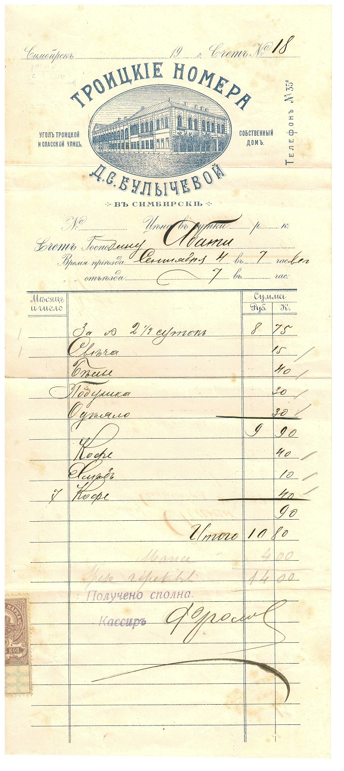 Самое ценное в коллекции - обычные любительские снимки. Например, интерес представляет чек из гостиницы «Троицкие номера». Гостиница считалась лучшей в городе, и позволить себе остановиться в ней мог не каждый. Отсюда ее второе название - «Дворянская». В 1901 году в «Троицких номерах» останавливались русские писатели Николай Георгиевич Гарин-Михайловский и Алексей Толстой. А вот о том, что проездом в Симбирске был и господин Абати - майор, действительный военный атташе при посольстве Италии, гласит только найденный Шевалдовым чек.