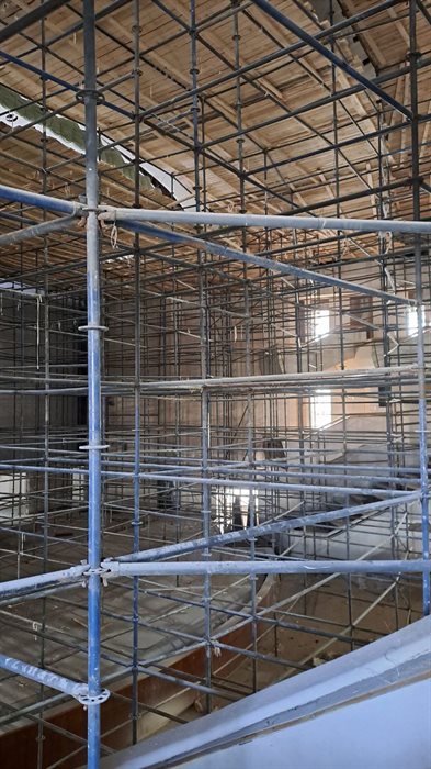 Концертный зал заполнен металлическими лесами с деревянными настилами. Все это сделано для того, чтобы обновить потолки и стены.