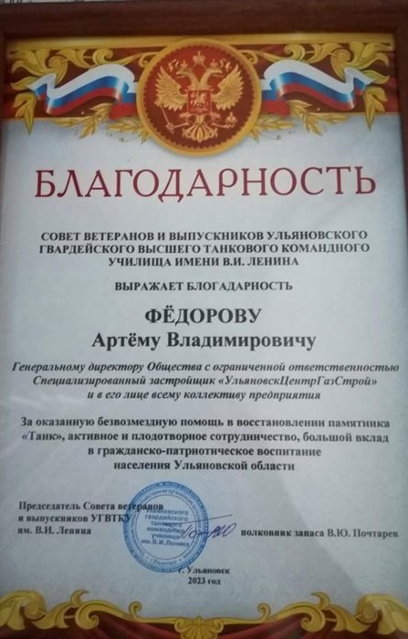 Отметим, сегодня, во время празднования юбилея училища, совет ветеранов и выпускников ульяновского гвардейского высшего танкового командного училища имени В. И. Ленина наградил грамотой Артема Фёдорова - генерального директора ООО специализированный застройщик «УльяновскЦентрГазСтрой», за оказанную безвозмездную помощь в восстановлении памятника «Танк», активное и плодотворное сотрудничество, большой вклад в гражданско-патриотическое воспитание населения Ульяновской области.