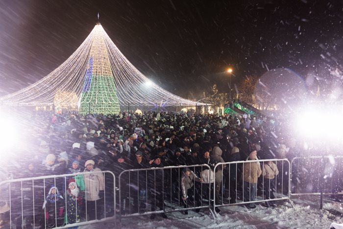 Напомним: световое убранство, представляющее собой объемную конструкцию в виде светящегося шатра округлой формы, приобрели год назад в Новосибирске за пять миллионов рублей. Шатер, имеющий высоту около 20 метров и 40-метровый диаметр, держится на 34 стойках со светящимися опорными основаниями и имеет 136 светящихся провиса длиной 30 метров каждый.