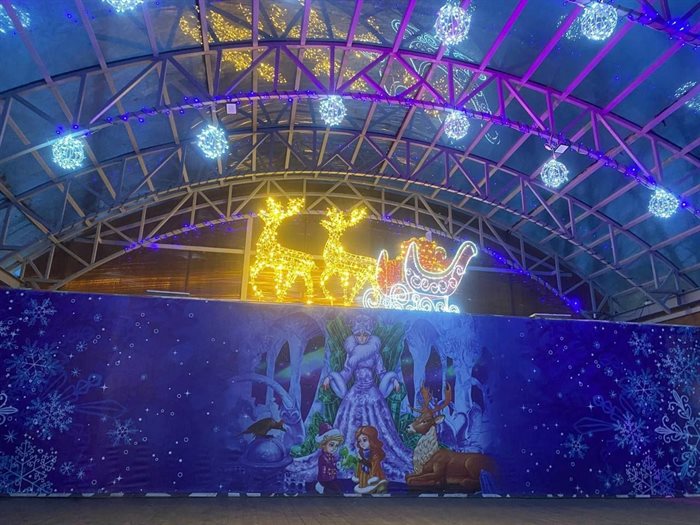 В спортивной зоне разместят круговой каток, световые деревья, новогоднюю арку и елки в кадках, а в детской игровой зоне - двускатные горки.