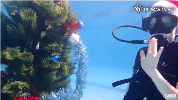 У Ани Горшениной и спецкора «УлПравды» – дебют. Они впервые надели на себя акваланги. Поначалу намного непривычно, но уже через пару минут ребята и правда, рассекают под водой как акулы. На глубине их уже ждут ёлочка и Дед Мороз с мишурой-игрушками и мешком подарков. Прежде чем перейти к самой приятной части праздника – вручению даров, - нужно украсить зелёную красавицу. Игрушки поначалу никак не хотят закрепляться на ветках и всё норовят уплыть наверх – в более привычные условия. Но спустя всего пару минут ёлочка нарядная, и Дед Мороз готов вручить юным дайверам награду за их смелый эксперимент.