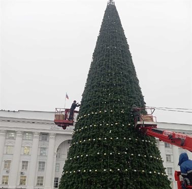 На Соборной площади в Ульяновске готовят праздничную елку к встрече Нового года.