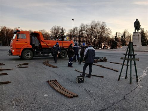 Специалисты Городского центра по благоустройству и озеленению начинают устанавливать новогоднюю елку на Соборной площади в Ульяновске.