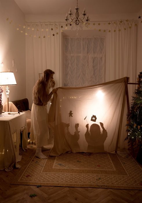 Если фотосессия в помещении, то и ее можно обыграть, например, украшая елку.