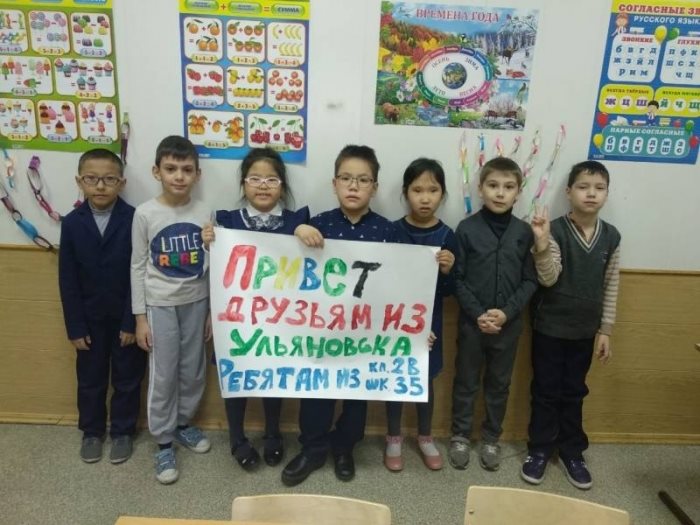 Второклассники школы № 35 Ульяновска получили поздравления от учащихся первого класса гуманитарного лицея Якутска. Из Республики Саха в Ульяновск также была отправлена посылка с волшебными талисманами якутского Деда Мороза Эhээ Дьыла, местным шоколадом и книгами о крае.