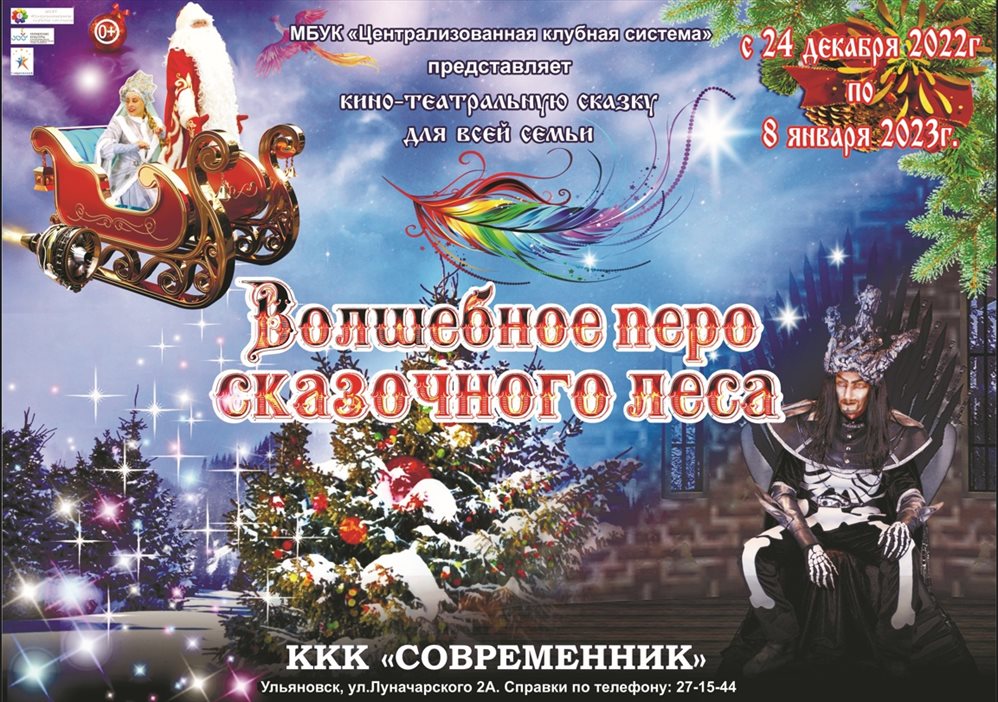Так, в киноконцертном комплексе «Современник» (Ульяновск, улица Луначарского, 2а) пройдет новогодняя сказка «Волшебное перо сказочного леса». В программе – конкурсы и развлечения с участием Деда Мороза и Снегурочки, кинотеатральная сказка для всей семьи «Волшебное перо сказочного леса» и фотосессия. Посетить мероприятие можно будет ежедневно с 24 декабря по 8 января в 11:00 и 14:00.