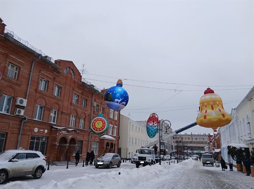 Вчера, 25 декабря, специалисты Городского центра по благоустройству и озеленению украсили улицу Федерации в Ульяновске надувными фигурами в виде советских елочных игрушек.